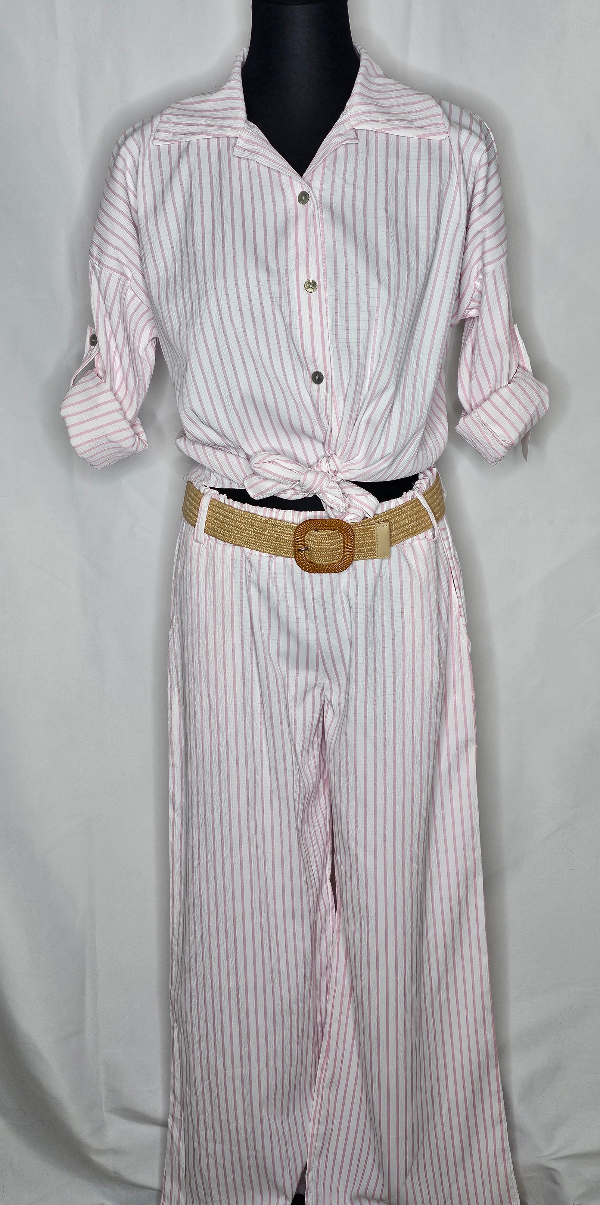 • Gestreifte Frühling zweiteiler mit Gürtel (Einheitsgrösse tragbar bis L) Damen-Zweiteiler